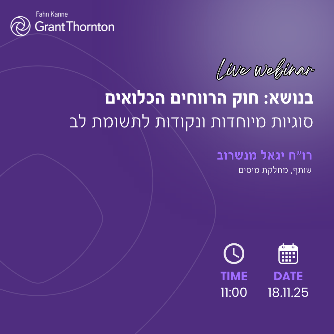 אנו מזמינים אתכם להצטרף אלינו לוובינר בנושא: חוק הרווחים הכלואים - סוגיות מיוחדות ונקודות לתשומת לב