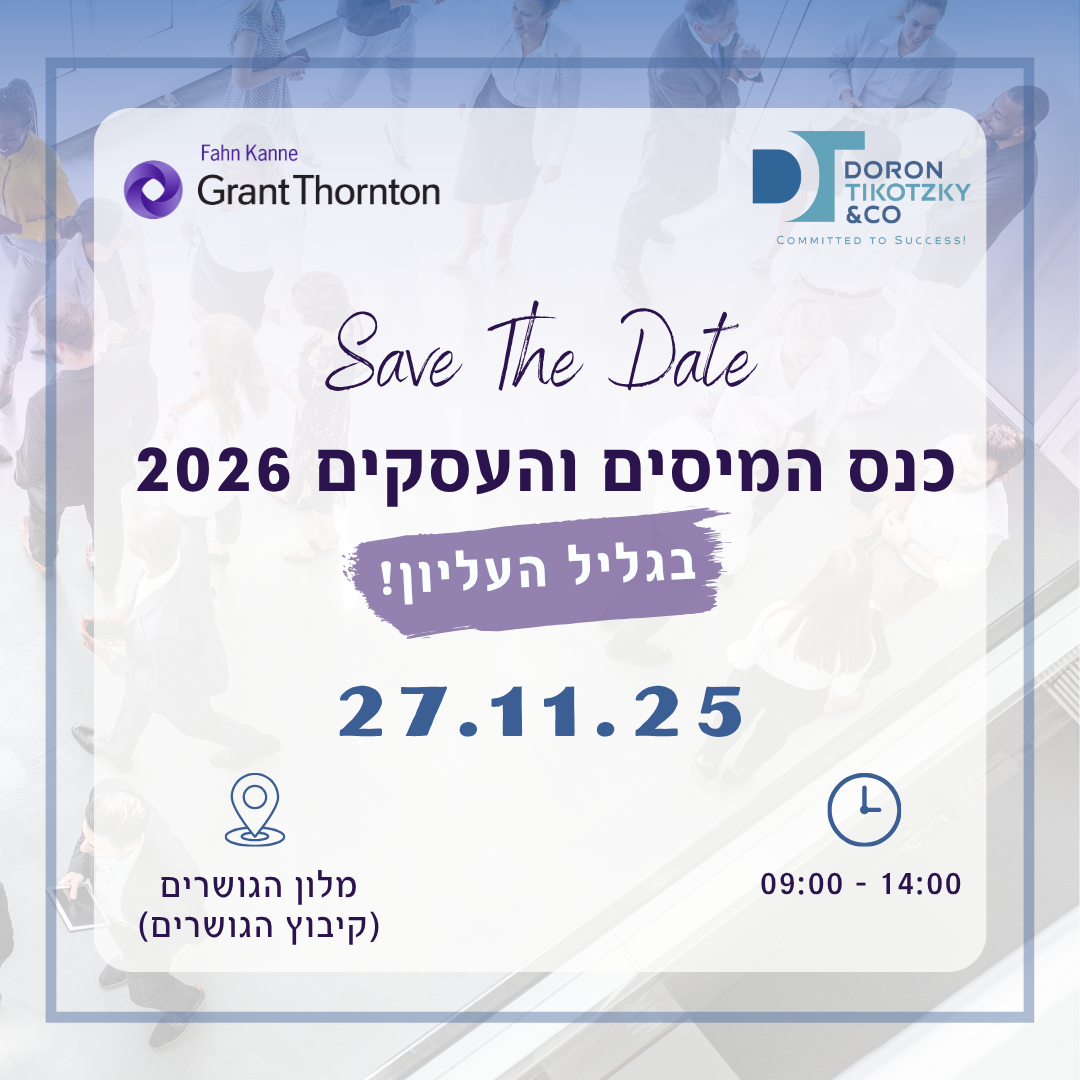 פירמת פאהן קנה GT Israel ומשרד עו"ד דורון, טיקוצקי ושות' מתכבדים להזמינכם: בעלי העסקים, הקיבוצים והקהילות שנמצאים בעיצומו של תהליך של שיקום וצמיחה ומהווים מנוע חשוב בהתאוששות הכלכלית של ישראל כולה, לכנס מיסים ועסקים שיתקיים בגליל העליון.